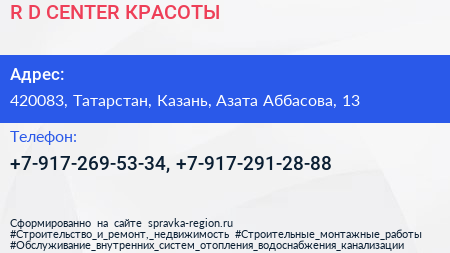 R & D CENTER КРАСОТЫ по адресу 420083, Татарстан, Казань, Азата Аббасова, 13 в дальнейшем Организация, размещена в следующих категориях: