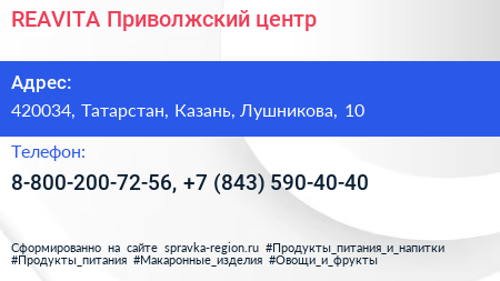 REAVITA, Приволжский центр по адресу 420034, Татарстан, Казань, Лушникова, 10 в дальнейшем Организация, размещена в следующих категориях: