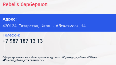 Rebel`s, барбершоп по адресу 420124, Татарстан, Казань, Абсалямова, 14 в дальнейшем Организация, размещена в следующих категориях: