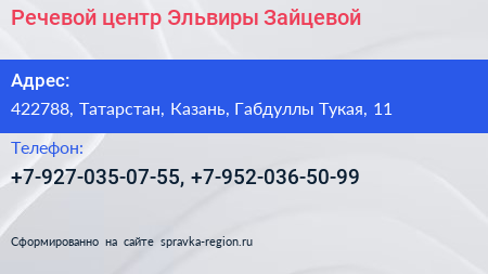 Речевой центр Эльвиры Зайцевой по адресу 422788, Татарстан, Казань, Габдуллы Тукая, 11 в дальнейшем Организация, размещена в следующих категориях: