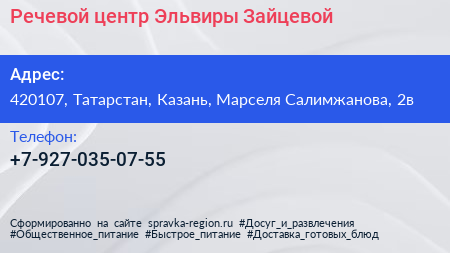 Речевой центр Эльвиры Зайцевой по адресу 420107, Татарстан, Казань, Марселя Салимжанова, 2в в дальнейшем Организация, размещена в следующих категориях: