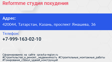 Reformme, студия похудения по адресу 420044, Татарстан, Казань, проспект Ямашева, 36 в дальнейшем Организация, размещена в следующих категориях: