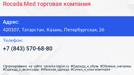 Rocada Med, торговая компания по адресу 420107, Татарстан, Казань, Петербургская, 26 в дальнейшем Организация, размещена в следующих категориях: