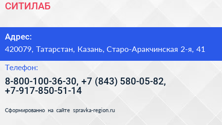 СИТИЛАБ по адресу 420079, Татарстан, Казань, Старо-Аракчинская 2-я, 41 в дальнейшем Организация, размещена в следующих категориях: