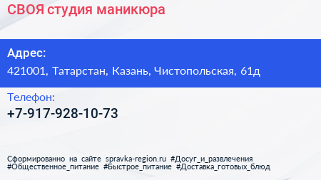 СВОЯ, студия маникюра по адресу 421001, Татарстан, Казань, Чистопольская, 61д в дальнейшем Организация, размещена в следующих категориях:
