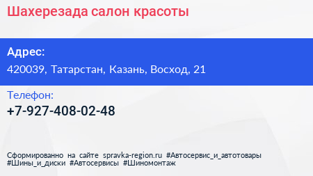 Шахерезада, салон красоты по адресу 420039, Татарстан, Казань, Восход, 21 в дальнейшем Организация, размещена в следующих категориях: