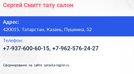 Сергей Смитт, тату-салон по адресу 420015, Татарстан, Казань, Пушкина, 52 в дальнейшем Организация, размещена в следующих категориях: