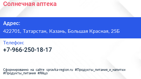 Солнечная, аптека по адресу 422701, Татарстан, Казань, Большая Красная, 25Б в дальнейшем Организация, размещена в следующих категориях: