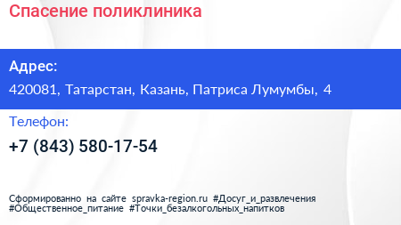 Спасение, поликлиника по адресу 420081, Татарстан, Казань, Патриса Лумумбы, 4 в дальнейшем Организация, размещена в следующих категориях: