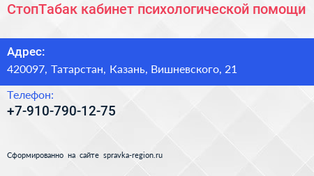 СтопТабак, кабинет психологической помощи по адресу 420097, Татарстан, Казань, Вишневского, 21 в дальнейшем Организация, размещена в следующих категориях: