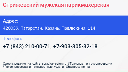 Стрижевский, мужская парикмахерская по адресу 420059, Татарстан, Казань, Павлюхина, 114 в дальнейшем Организация, размещена в следующих категориях:
