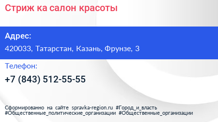 Стриж`ка, салон красоты по адресу 420033, Татарстан, Казань, Фрунзе, 3 в дальнейшем Организация, размещена в следующих категориях:
