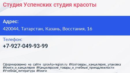Студия Успенских, студия красоты по адресу 420044, Татарстан, Казань, Восстания, 16 в дальнейшем Организация, размещена в следующих категориях: