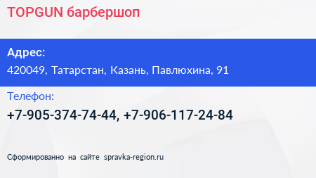 TOPGUN, барбершоп по адресу 420049, Татарстан, Казань, Павлюхина, 91 в дальнейшем Организация, размещена в следующих категориях: