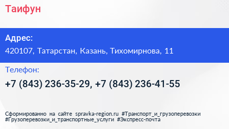 Таифун по адресу 420107, Татарстан, Казань, Тихомирнова, 11 в дальнейшем Организация, размещена в следующих категориях: