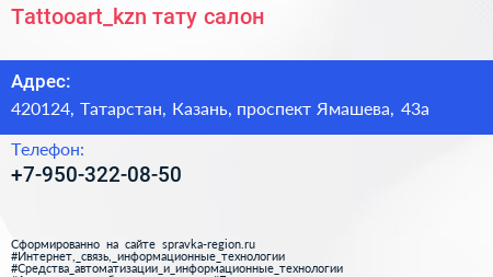 Tattooart_kzn, тату-салон по адресу 420124, Татарстан, Казань, проспект Ямашева, 43а в дальнейшем Организация, размещена в следующих категориях: