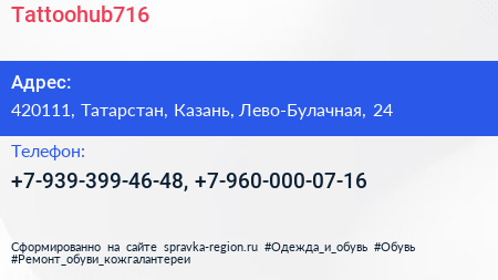 Tattoohub716 по адресу 420111, Татарстан, Казань, Лево-Булачная, 24 в дальнейшем Организация, размещена в следующих категориях: