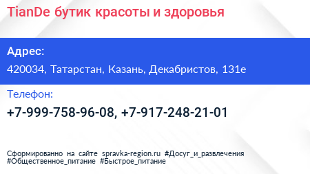 TianDe, бутик красоты и здоровья по адресу 420034, Татарстан, Казань, Декабристов, 131е в дальнейшем Организация, размещена в следующих категориях: