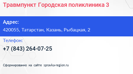 Травмпункт, Городская поликлиника №3 по адресу 420055, Татарстан, Казань, Рыбацкая, 2 в дальнейшем Организация, размещена в следующих категориях: