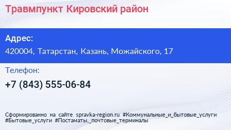 Травмпункт, Кировский район по адресу 420004, Татарстан, Казань, Можайского, 17 в дальнейшем Организация, размещена в следующих категориях: