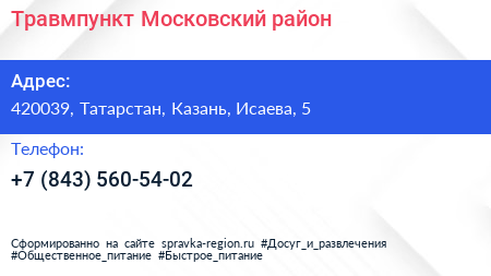 Травмпункт, Московский район по адресу 420039, Татарстан, Казань, Исаева, 5 в дальнейшем Организация, размещена в следующих категориях: