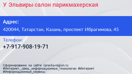 У Эльвиры, салон-парикмахерская по адресу 420044, Татарстан, Казань, проспект Ибрагимова, 45 в дальнейшем Организация, размещена в следующих категориях: