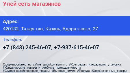 Улей, сеть магазинов по адресу 420132, Татарстан, Казань, Адоратского, 27 в дальнейшем Организация, размещена в следующих категориях: