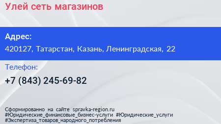 Улей, сеть магазинов по адресу 420127, Татарстан, Казань, Ленинградская, 22 в дальнейшем Организация, размещена в следующих категориях: