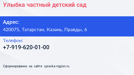 Улыбка, частный детский сад по адресу 420075, Татарстан, Казань, Правды, 6 в дальнейшем Организация, размещена в следующих категориях: