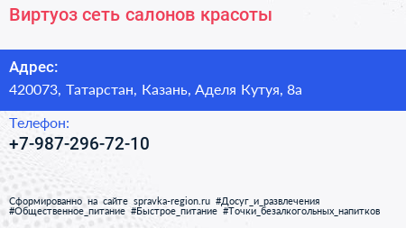 Виртуоз, сеть салонов красоты по адресу 420073, Татарстан, Казань, Аделя Кутуя, 8а в дальнейшем Организация, размещена в следующих категориях: