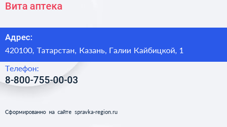 Вита, аптека по адресу 420100, Татарстан, Казань, Галии Кайбицкой, 1 в дальнейшем Организация, размещена в следующих категориях: