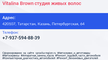 Vitalina Brown, студия живых волос по адресу 420107, Татарстан, Казань, Петербургская, 64 в дальнейшем Организация, размещена в следующих категориях: