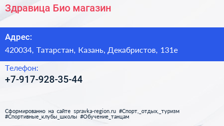 Здравица-Био, магазин по адресу 420034, Татарстан, Казань, Декабристов, 131е в дальнейшем Организация, размещена в следующих категориях: