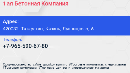 1-ая Бетонная Компания по адресу 420032, Татарстан, Казань, Лукницкого, 6 в дальнейшем Организация, размещена в следующих категориях: