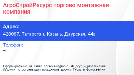 АгроСтройРесурс, торгово-монтажная компания по адресу 420087, Татарстан, Казань, Даурская, 44в в дальнейшем Организация, размещена в следующих категориях:
