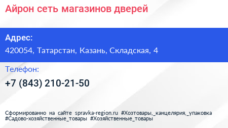 Айрон, сеть магазинов дверей по адресу 420054, Татарстан, Казань, Складская, 4 в дальнейшем Организация, размещена в следующих категориях:
