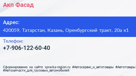 Акп-Фасад по адресу 420059, Татарстан, Казань, Оренбургский тракт, 20а к1 в дальнейшем Организация, размещена в следующих категориях: