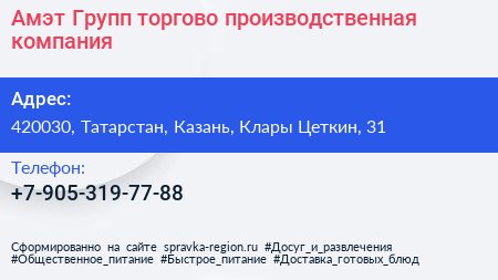 Амэт Групп, торгово-производственная компания по адресу 420030, Татарстан, Казань, Клары Цеткин, 31 в дальнейшем Организация, размещена в следующих категориях: