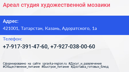 Ареал, студия художественной мозаики по адресу 421001, Татарстан, Казань, Адоратского, 1а в дальнейшем Организация, размещена в следующих категориях: