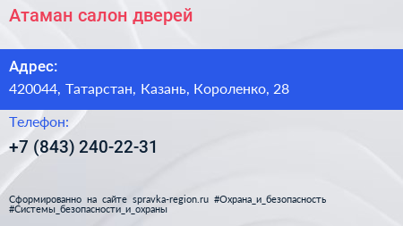 Атаман, салон дверей по адресу 420044, Татарстан, Казань, Короленко, 28 в дальнейшем Организация, размещена в следующих категориях: