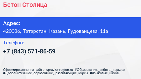 Бетон Столица по адресу 420036, Татарстан, Казань, Гудованцева, 11а в дальнейшем Организация, размещена в следующих категориях: