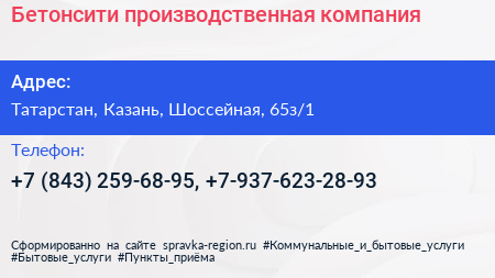 Бетонсити, производственная компания по адресу Татарстан, Казань, Шоссейная, 65з/1 в дальнейшем Организация, размещена в следующих категориях:
