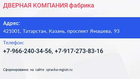 ДВЕРНАЯ КОМПАНИЯ, фабрика по адресу 421001, Татарстан, Казань, проспект Ямашева, 93 в дальнейшем Организация, размещена в следующих категориях: