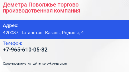 Деметра-Поволжье, торгово-производственная компания по адресу 420087, Татарстан, Казань, Родины, 4 в дальнейшем Организация, размещена в следующих категориях: