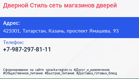 Дверной Стиль, сеть магазинов дверей по адресу 421001, Татарстан, Казань, проспект Ямашева, 93 в дальнейшем Организация, размещена в следующих категориях:
