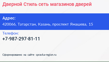 Дверной Стиль, сеть магазинов дверей по адресу 420066, Татарстан, Казань, проспект Ямашева, 15 в дальнейшем Организация, размещена в следующих категориях: