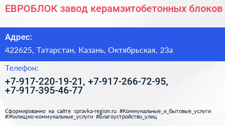 ЕВРОБЛОК, завод керамзитобетонных блоков по адресу 422625, Татарстан, Казань, Октябрьская, 23а в дальнейшем Организация, размещена в следующих категориях: