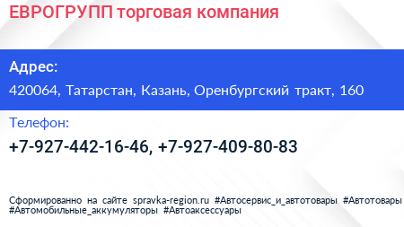 ЕВРОГРУПП, торговая компания по адресу 420064, Татарстан, Казань, Оренбургский тракт, 160 в дальнейшем Организация, размещена в следующих категориях: