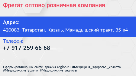 Фрегат, оптово-розничная компания по адресу 420083, Татарстан, Казань, Мамадышский тракт, 35 к4 в дальнейшем Организация, размещена в следующих категориях: