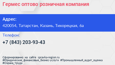 Гермес, оптово-розничная компания по адресу 420054, Татарстан, Казань, Тихорецкая, 6а в дальнейшем Организация, размещена в следующих категориях: